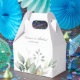 Beautiful wedding favor box featuring watercolor eucalyptus and gold leaves.