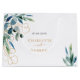 A chic white background. Decorated with watercolored eucalyptus greenery, and golden foliage. Personalise and add a date and the name of the bride and groom. Grey and golden text.