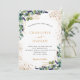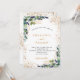 A white background decorated with eucalyptus greenery and golden foliage. Personalise and add your names and wedding details. Black and golden coloured letters.