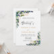 A white background decorated with watercolored eucalyptus greenery, lavender florals and golden foliage. Personalise and add your names and wedding details. Black and golden coloured letters.