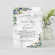 Marble print as background decorated with eucalyptus greenery and golden foliage. Personalise and add your names and wedding details. Black letters.