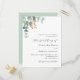 A chic white background. Decorated with green watercolored eucalyptus leaves, sprigs, greenery and a faux gold sprig. Personalise and add your names and wedding details. Black letters.