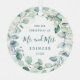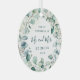 Elegant ornament featuring a wreath comprised of eucalyptus leaves and greenery with a hint of blue with "Our First Christmas as Mr. and Mrs." along with your last name and year in dark green over a pastel watercolor wash. The backside has your favourite wedding photo. This rustic, botanical ornament also makes a great gift for a newlywed couple for their first Christmas.