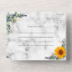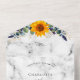 A marble print background decorated with watercolored sunflowers, eucalyptus greenery and golden leaves. Personalise and add your names, monogram and wedding details.