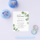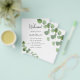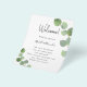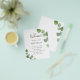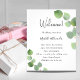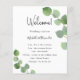 A modern, elegant, wedding program, timeline. White background, decorated with eucalyptus greenery, sprigs. Personalise and add your names and wedding details. Black coloured letters. If you have more text it's possible to reduce the line space and also add text on the back.