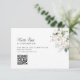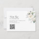 A QR code RSVP wedding card with simple black lettering, eucalyptus foliage and white flowers.
