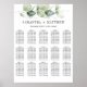 Elegant wedding seating chart featuring eucalyptus greenery watercolor foliage with modern typography on white background