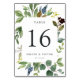 Garden chic table number cards feature a border of green watercolor foliage and eucalyptus leaves, framing your table number in rich off-black. Personalise with your names and wedding date, or name each table for an extra personal touch. Design repeats on reverse side. Coordinates with our Eucalyptus Grove wedding invitation suite.