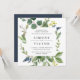 Our Eucalyptus Grove wedding invitation in a unique square format frames your wedding details with watercolor eucalyptus foliage, green leaves and tiny navy blue buds. A modern yet organic choice for fall and winter weddings featuring fresh green botanical foliage and elegant lettering.