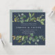 Our Eucalyptus Grove wedding invitation in a unique square format frames your wedding details with a top and bottom border of painted watercolor leaves and eucalyptus foliage in soft shades of green, on a smoky navy blue background.