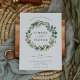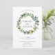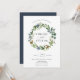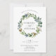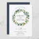 Elegant botanical wedding invitations feature a wreath of lush eucalyptus foliage, green leaves and tiny navy blue buds, encircling your names. Personalise with your wedding details beneath.