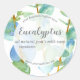 A pretty sticker label decorated with eucalyptus leaves illustrated with watercolor with a white circle to include your business details and ingredients list. Edit the text with your business details.