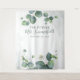 Eucalyptus Leaves Succulent Photo Booth Tapestry. Great party wall decoration and banner for a trendy modern botanical theme bridal shower. Featuring greenery eucalyptus with watercolor blush background. Easily change the details by clicking the "Personalise" button above.