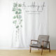 Eucalyptus Names Date Wedding Photo Backgroundhandy for you and your wedding guests to take some memorable photos against, with a beautiful branch of Watercolor eucalyptus leaves flowing down from the top left hand side and set informal stylish script for The Wedding Of on white. Easily personalise your names and wedding date.