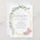 Trendy geometric eucalyptus greenery and blush pink roses confirmation invitation with gold geometric frame and mint watercolor wash reverse.