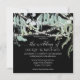 Soft grey, faded, distressed barn wood background on the reverse side and Black background with twinkle light strings and downward hanging Eucalyptus leaves and seeds are combined with hand lettered calligraphy script handwriting font text "the wedding of." Modern. BOLD. Romantic. COMPLETE COLLECTION: https://bit.ly/39xwDxr (copy and paste link into browser). Watercolor artwork was created by artist, Audrey Jeanne Roberts. Copyright.