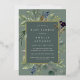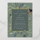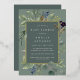 Chic botanical gender neutral baby shower invitation features a border of lush sage green botanical leaves and watercolor eucalyptus foliage with gold foil trim. Personalise with your baby shower details in modern lettering on a tone on tone moss green background.