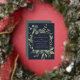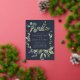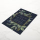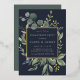 Our Eucalyptus & Sage engagement party invitation frames your party details with an elegant square border of lush watercolor eucalyptus and sage green leaves, with real gold foil trim on a rich midnight blue background.