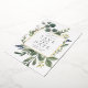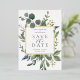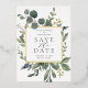 Our Eucalyptus & Sage wedding save the date frames your wedding details with an elegant square border of lush watercolor eucalyptus and sage green leaves, with real gold foil trim on a crisp white background.