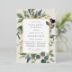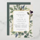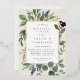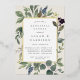 Chic botanical rehearsal dinner invitation features a border of lush sage green botanical leaves and watercolor eucalyptus foliage with gold foil trim. Personalise with your ceremony rehearsal and dinner details in modern lettering on a crisp white and soft ivory background.