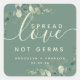 This modern design says spread love not germs in trendy script typography surrounded by eucalyptus leaves. Personalise with your names and wedding date.
