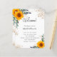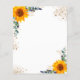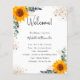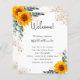 A modern, elegant, wedding program, timeline. A chic white background. Decorated with sunflowers, green watercolored eucalyptus leaves, sprigs, greenery, faux gold leaves and golden glitter spots. Personalise and add your names and wedding details. Black coloured letters. If you have more text it's possible to reduce the line space.