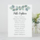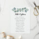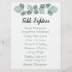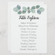 Botanical eucalyptus wedding table number sheet of paper with list of names. Pale green paper - shown here on the thickest 17.5 weight, in largest size - has bold, blue-green script at the top for the table number and a list of names printed beneath. Both fonts are modern and have a hand-written look. Combine names if needed, or leave spaces. The nature theme will work for many wedding types including rustic and outdoor. Hang on a background of some kind to match your wedding theme for an easy way to help guests find their tables. Reverse is blank. If larger paper is needed, transfer this design to a poster or 8x11 inch paper.