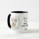 "LOVE MY IRISH WOLFHOUND" declares this mug for the Wolfhound dog owner. Each side of the mug has a portrait of a gray and white Irish Wolfhound framed by soft green watercolor eucalyptus leaves. Between the two images is the text, which may be easily customized, or even removed by you, and your monogram or name.