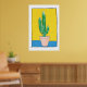 This poster has a simple composition, hand drawn using pens and watercolour, of a Euphorbia cactus in a terracotta flower pot.  The cactus is shaped somewhat like a candlestick.  The cactus is green, against a backdrop of yellow and blue, with a narrow black line around.  The picture is on a white background.  It's a charming example of simple, naive, original art, only available from The Art of Being Beth.