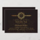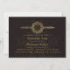 A luxurious invitation in shades of gold against a dark background with an abstract floral pattern. Well suited for any formal celebration. The gold wreath can hold initials or a year.