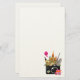 Stationery with a graphic illustration featuring European landmarks such as leaning tower of Pisa, Big Ben, Eiffel Tower etc... A hot air balloon in the sky and a double decker bus, with a large camera. A stamp with the Egyptian pyramids stuck to the camera.