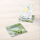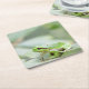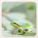 Coaster with a green european tree frog, hyla arborea, sitting on leaves creating a green background. Taken in the Netherlands.