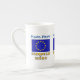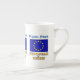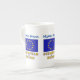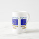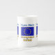 Bone china mug features the EU Flag with the words EUROPEAN UNION below. Above is a space for your name, in blue letters, to add a personalised touch or for gift. The EU Flag has a dark blue background with a circle in the centre of gold, or yellow, stars. Perfect housewarming gift for your favourite Europhile.