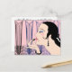The lovely Art Deco Eve in profile applies her lipstick against a backdrop of a classic art deco design. Eve has been lovingly redrawn from a vintage French cosmetic advertisement. The background design was derived from vintage Art Deco ironwork. This version features the beautiful Eve with jet black hair, blue eye shadow, dark brown eyes and rosy pink lips. The background is baby pink with ironwork in shades of blue and black.