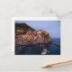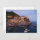 The five fishing villages that comprise the Cinque Terre (5 lands) are all contained within the UNESCO World Heritage Site of Cinque Terre National Park. In this image, a romantic view of the town of Manarola minutes after the sun set, with the lights of the colourful town beginning to flicker on and the waves crash against the shores of the Italian cliff. Though at one point, the primary industry was fishing, today it is tourism. This landscape photograph makes a great souvenir for those who have already taken a trip to this jewel of Italy or those who are dreaming of their Italian trip. This postcard is fully customisable.
