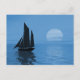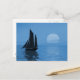 A boat sailing on a calm ocean with the sun slipping over the horizon. The whole picture is in the evening shades of blue.