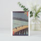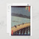 This Japanese colour print was created by Ichiyusai Hiroshige in the 19th Century. The full name of the print is: "Evening Shower at Atake and the Great Bridge". This Japanese print is from the famous series: One Hundred Famous Views of Edo" (Meisho Yedo Hiakkei). In it we see a few Japanese workers crossing a large bridge, while a storm is raging, and a lot of rain is falling. They're covering themselves with straw hats, coats and perhaps umbrellas. In the background we also see a Japanese sailor on a canoe like boat crossing the river. The sky is quite dark because of the storm, and it's too dark to see the forests behind. The artist has also signed this artwork in Kanji characters and Hiragana (Japanese writing).