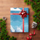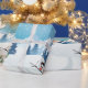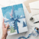Evening village winter landscape with snow covered houses,snowman and mountains. Christmas holidays illustration