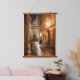 The polyester fabric displayed many wrinkles and several sharp creases throughout. At the bottom of the tapestry, I noticed a bulge in the fabric because it was not pulled tight enough before being connected to the wooden boards. It took me over an hour to spay water on the tapestry before putting it on an ironing board where I used a warm iron over a polyester cloth to remove the wrinkles and creases in the material. I was able to get out the wrinkles and creases that made that tapestry look as beautiful as its picture.