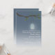 An outdoors evening wedding invitation featuring an illustration of a mason jar with candle inside hanging from a tree branch with green leaves. Personalise the text with your information.