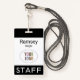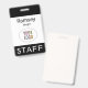 Personalise our professional event staff name badge with your event logo, employee name, or other custom text. It's pvc plastic and available with a metal clip, lanyard, or a retractable reel. This is a black and white name badge with a modern minimalist design. You can easily customise the colours, fonts, and design and optionally add content to the back. No minimum order quantity and no setup fee.