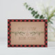 A wedding r.s.v.p. featuring an illustration of two evergreen tree branches. Background is red and black plaid. Personalise the text.