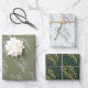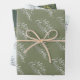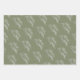 Set of three gift wrapping paper sheets featuring neutral green, sage, and pine green colour theme with "Merry Christmas" in gold and silver script. Measures 19" x 29" inches. Available in matte and semi-gloss finish.