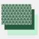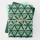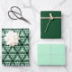 A set of three decorative 19x29" wrapping papers: a patterned sheet featuring a cluster of intricate deep green spirals in a triangular pattern, and solid Evergreen and Mint Green colour sheets for a sophisticated gift presentation collection.