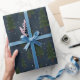 Wrap your gifts in a cozy evergreen tree pattern featuring simple pine trees and soft snow dots scattered across a deep dark blue background.