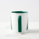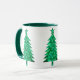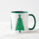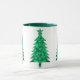 Mug in a classic silhouette of a Christmas tree in dark pine green / evergreen, patterned with geometric snowflakes in pastel green, aqua and ice blue