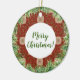 This simple design holiday design has a red pattern with a layer of evergreens, on top that form a wreath. In the centre of the design there is a white circle with the words "Merry Christmas". On the back the design is the same. Both text areas can be personalised with your message.