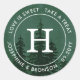 Hand painted evergreen trees on a misty mountain in dark green tones; Customise with your own text and initial as well as editable border colour