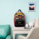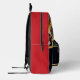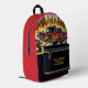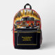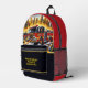 This custom First Responder Backpack Bag features A red fire truck with a fireman standing nearby, in front of a cityscape backdrop with flames. symbolising bravery and heroism,