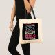 Hockey theme tote bag for the hockey girl with hockey pucks, sticks and helmets with pink, white, and blue text that reads Sugar, Spice and Everything Ice That's What Hockey Girls Are Made Of!